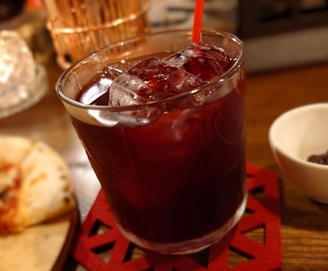 少し苦味が残る赤ワインに、オレンジスライスでフルーティーさをプラス、さらに、一緒に添えられたいくつかのフルーツを煮出して作られた自家製のジャムを入れると甘さと風味が加わり、美味しいサングリアの出来上がり♪