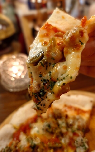 たっぷりと乗ったトロトロのチーズと具材はボリュームがあり、生地を持ち上げるとズシリと重く感じる、旨味たっふのピッツァです♡