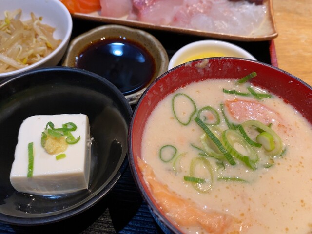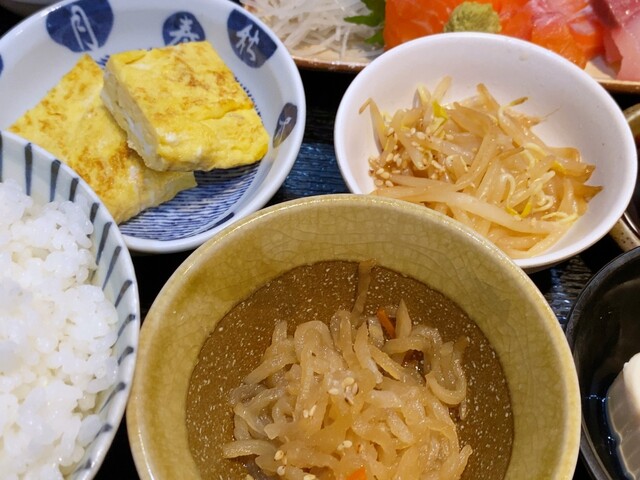 お造りの他に、御飯と味噌汁、サラダ、お漬物、おばんざい3品と玉子焼きが付きます。