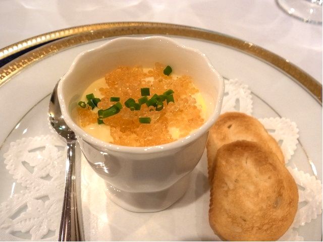 地鶏卵のクレーム・ブルイエ、キャビアドール添え