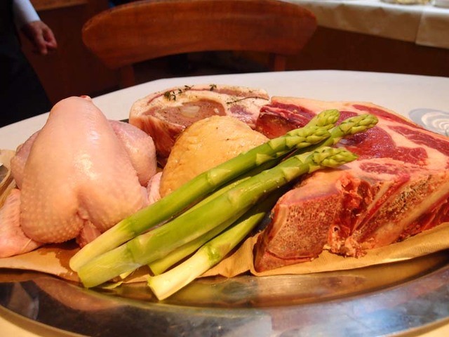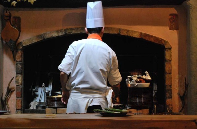 特製のシュミネ【暖炉】で楢材の薪を使い、若鶏や仔羊、若鶏を豪快に炙り焼きに!