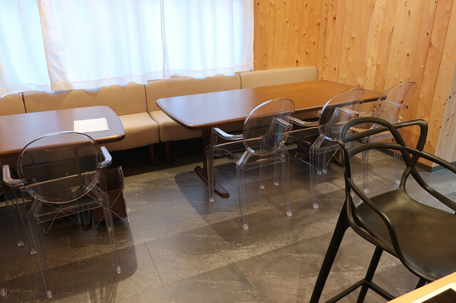 いきなりドンと大きなテーブル、大きすぎる椅子、全面白木の壁。