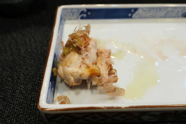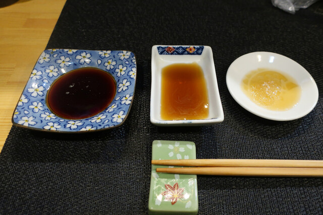 薬味は山葵、柚子胡椒、塩油、肝醤油などなど。