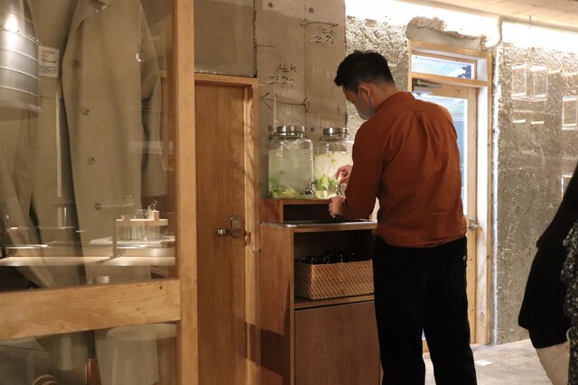 椅子の下とテーブルについているフックに手荷物は置け、臭いが気になるコートなどは扉付きの場所に置けるようになっています。お水と、生卵はセルフサービスです。