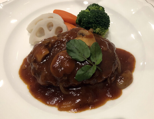 北海道産牛肉煮込みハンバーグ温野菜1,000円。酸味強めのソースが赤ワインと合います。お皿もアツアツ