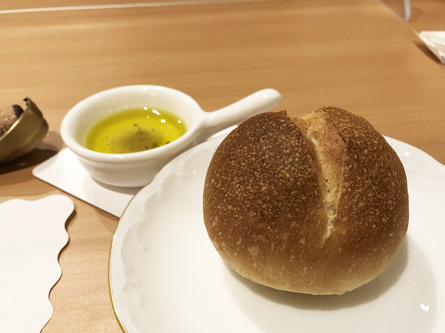 自家製パン(2種)300円のうち、先にいただけるプレーン。これも、添えられたオリーブオイルの塩コショウで、ずっと飲み続けられるお味。様子を見てくれていて、食べ終えるころにもう一ついただけます