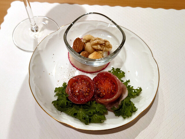 アミューズ・グール400円。おすすめをされたらお断りをしないのがマナーと何かで知りました。いつも美味しいので、お断りする理由がありません。この日は、甘いミニトマトと生ハム。スナックの下に大根(?)が敷いてあって、ちょっとした気遣いが感じられます