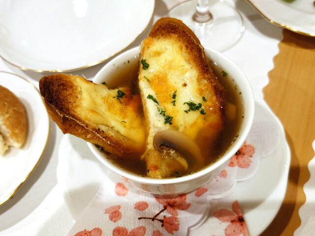 オニオングラタンスープ、魚のムニエルをいただきました。