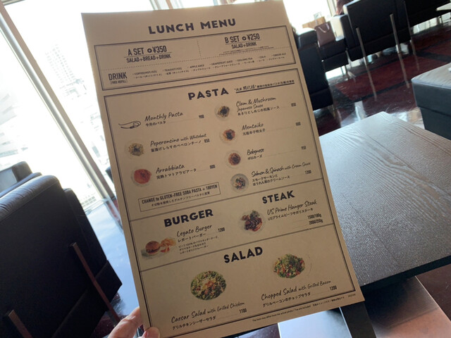 ランチメニューから、あさりとしめじの和風ソースのパスタ 850円(税込み)とグリルチキンシーザーサラダ 1,100円(税込み)、+Bセット(サラダ+ドリンク)250円(税込み)、ハウスワイン 500円(税込み)をチョイス。