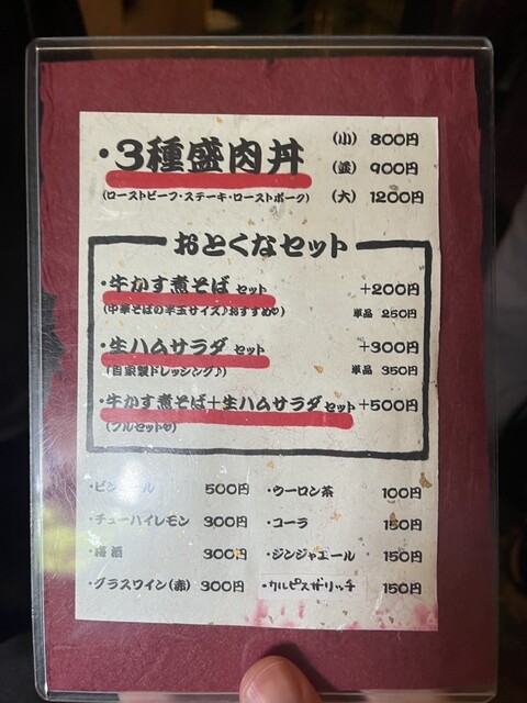 席に座り、3種盛肉丼、牛かす煮そばセットいただきました。