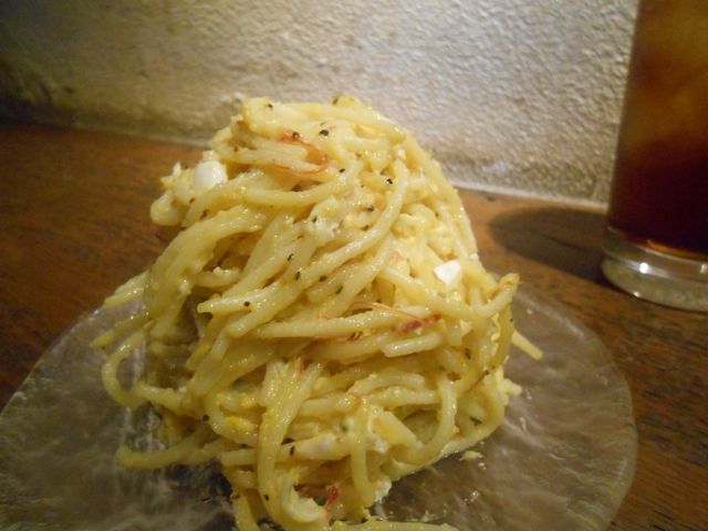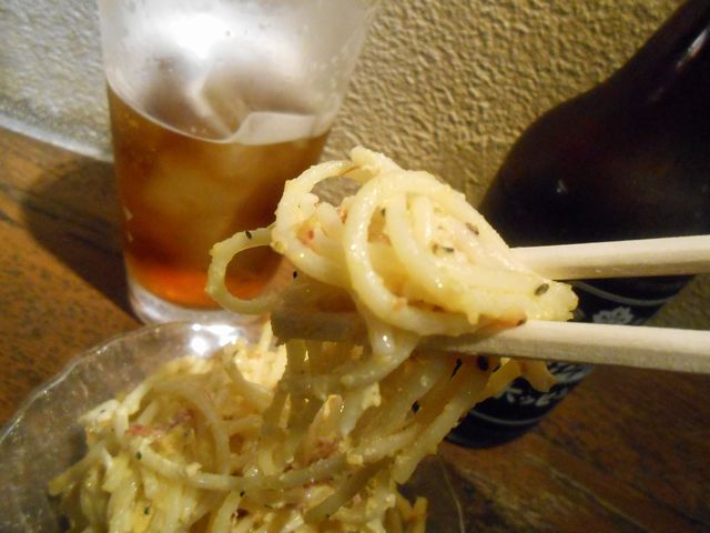 食べログトップ5000にランクされるこちらの店、店内のドリンクもつまみも原則300円の店です。 店の内装も木の感触を生かした落ち着いた物で、ほっとできます。 まずは、生中@300円とスパサラ@300円を正面のカウンターでお願いしました。 生中は大きめのグラスで出てきます。 名物のスパサラは、春から秋のメニューで、ねっちょりした食感のスパゲティーが山盛り出てきます。 このスパサラを目当てに来店する人も多いですよ~。