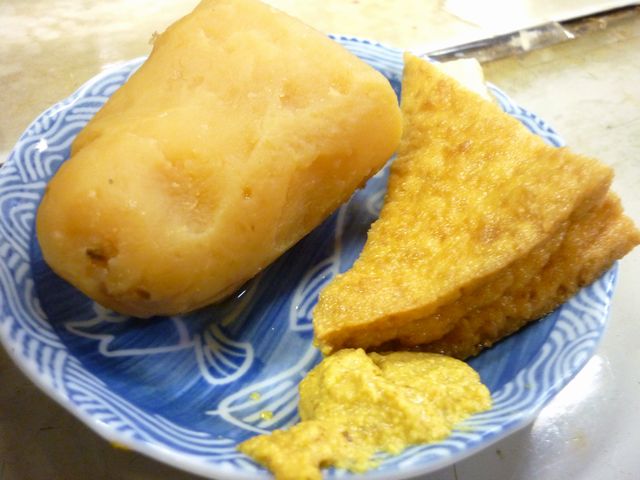 最初は、小瓶ビール@280円ときんぴら@180円をお願いしました。 もちろんこちらの名物の無料お通しのおでん2個がでてきます。 この日はジャガイモと厚揚げですね。 注文品は、お店のお父さんが黙って持ってきてくれますが、おでんにはからしが、キンピラには七味が付いてきます。 お客には気を使っているのですが、寡黙なハードボイルドな雰囲気です。