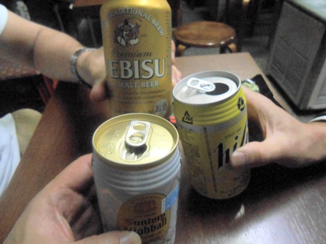 まず一軒目は5人でこちらのお店にやってきました。 お母さんにお願いして、店の横に5人分の席を作ってもらいました。 ここは、ドリンク持ち込みOKなので、スーパードライ(缶500)@270円x4とお茶割り(?)@120円で乾杯です。 一本はおかあさんへのお土産ですよ。