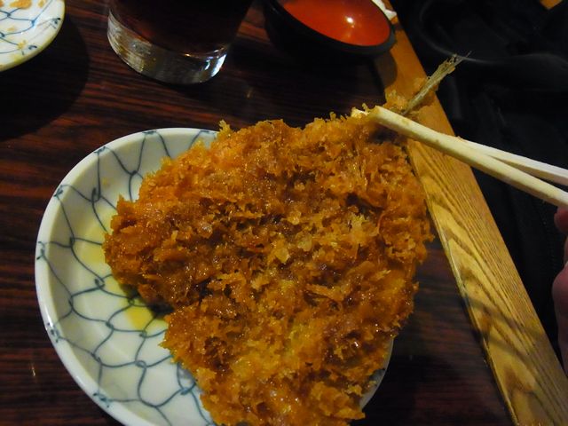 ここで、にごり酒@280円にホッピーセット@570円x2 (ソト@300円、ナカ270円)を追加です。 アルコールが進みますね。 やっちゃんの、「なんでも作るからワガママ言って下さい」の言葉に励まされて(笑)、ミックスフライ+ハムカツ@700円+450円?のメニューにない盛り込みを注文しました。 具だくさんと説明してもらったオムレツ@600円も追加です。 見事に山盛りの、ミックスフライ+ハムカツが出てきました。 揚げ物のプロのマイレビュアーさんによると、こちらのフライはコロモが暴れていて専門店並みの技だそうです。 じゃんけんで勝ったボクは、アジフライをもらいました。 醤油をかけて食べるアジフライ、ちょっと小ぶりですが、新鮮です。 オムレツもひき肉がタップリで、美味しかったです。