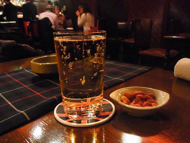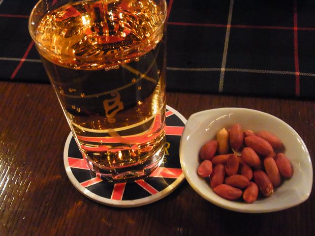 やはりここに来たらハイボール@1,100円(?)を注文でしょう (笑) 丁寧に作られたハイボール、小皿のナッツ@サービス?(300円説もあり)と一緒に供されます。 コースターもイギリスの国旗をあしらったもので、店の雰囲気にピッタリです。 マイレビュアーさんと話の内容は、ブログ・食べログの記事の書き方でしたが、あまり内容は覚えてません。 最近記憶力がとみに衰えてますね(汗)