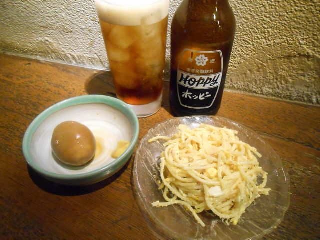 さて、次はホッピーセット(黒)@300円をお願いして、つまみは、はまちづけ@300円です。 ここは醤油と砂糖の効いた関東風の味付けです。 この味付けは、冬の名物のおでんや肉豆腐も同じです。 あ~早く冬が来ないかな~。 しっかりナカ@100円を追加です。 本当はもっとゆっくりしたかったのですが、次のお店を目指して移動です(笑)