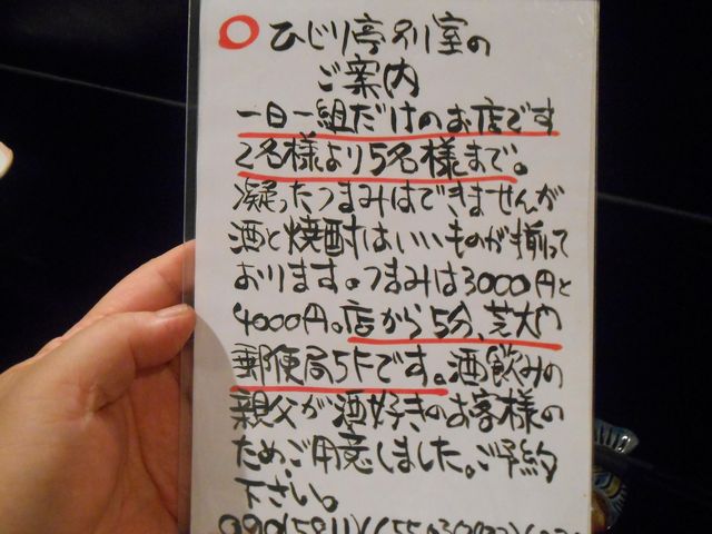 お店に入ると、あれいつもの大将がいません。 若い女性二人で切り盛りしてます。 どうやら、オヤヂさんは、一日一組限定の別館を始めたみたいです。 でも2人から5人までで、つまみが3,000円か4,000円と書いてあるので、また儲からない商売をするのでしょうか?