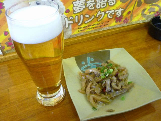 店内の両側にカウンターがある、小さなこの店、外のテーブルでは、外人さんが呑んでますね。 まず、生ビール(小)@180円とザーサイ@100円をもらいました。 これで280円です。安いですね。 ザーサイも100円と思えないほど量があります。 ビールは発泡酒ですが、安いので問題なしです。