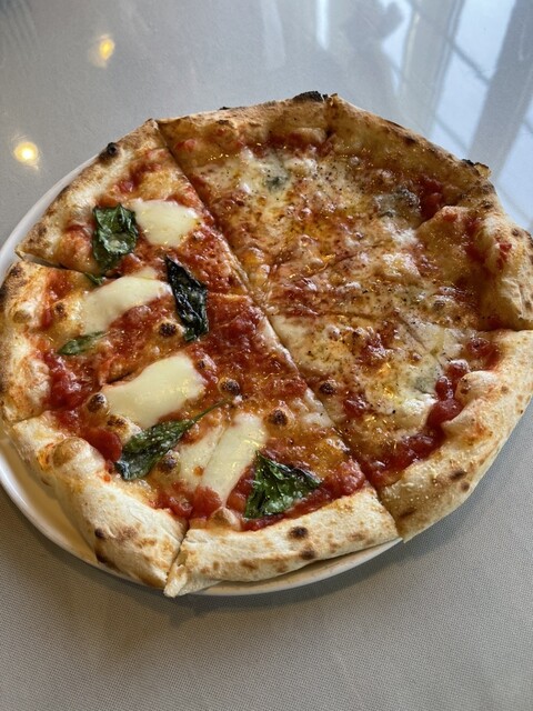 クワトロフォルマッジ(奥)とグラスワイン赤