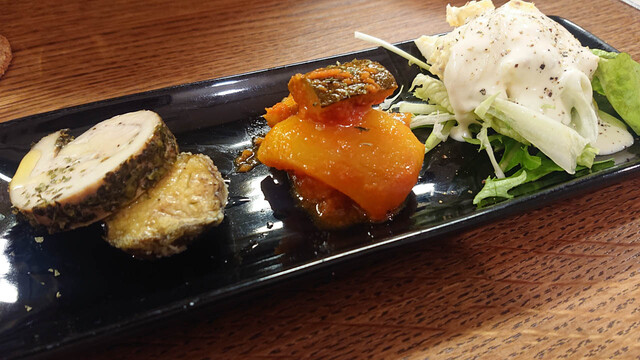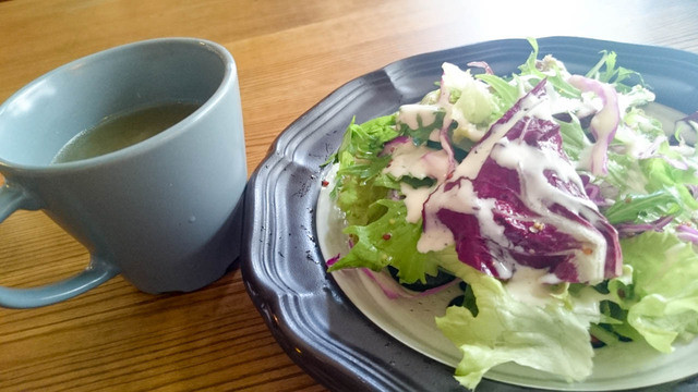 大きめに切られた南瓜は甘みが強く、なにより自慢のドレッシングが良い感じ。酵素入りのドレッシングは阿倍野や茶屋町で人気の「実身美」さんのドレッシングに通じるものがありますね。これ、販売していないのかなぁ……