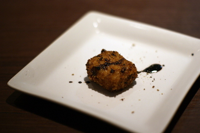 フォアグラのテリーヌにマデラ酒、ポートワインを使って甘味のある”具”。中は冷たいのに、外はさっくりカリカリの熱い衣。バルサミコの煮詰め方もパーフェクト。さっそくやられちゃいました。