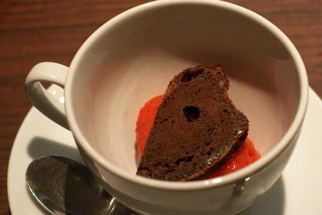 「手を抜いて楽に作ってる」とか田中シェフいいますが、きちんとしこんだチョコテリーヌと、手作りのソルベがコースを締めています。