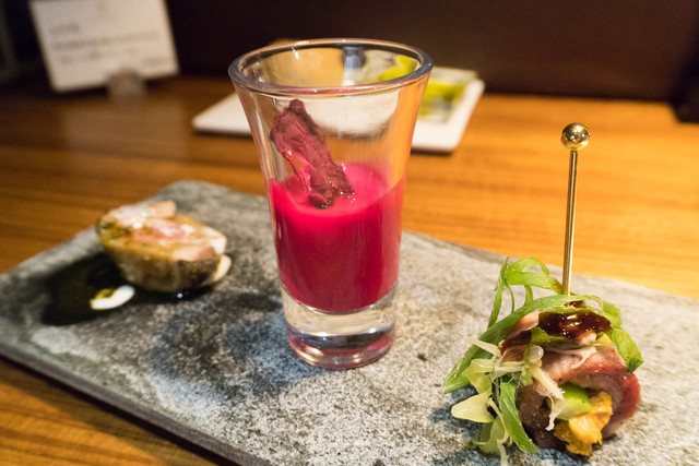 ・北海道産 秋刀魚のルエル 3種のハーブソース、備前牛のコールドビーフ、雲丹巻き、ビーツのポタージュ