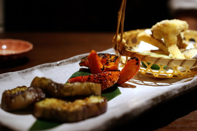 前菜五種(焼き鴨手まり寿司、猪豚のリエット、岩手県産ジャンボ木耳、蝦夷鹿のテリーヌ・ド・カンパーニュ、マタギ玉)厳選桜肉とタテガミの紅白馬刺し明石産サヨリの燻製自家詰馬肉のサルシッチャ本日の炭火焼野菜蝦夷鹿ロースと淡路猪豚ウデの炭火焼盛り合わせ〆の飯鹿の焼きおにぎり茶漬け秋野訪れの冷たい甘味前菜盛り