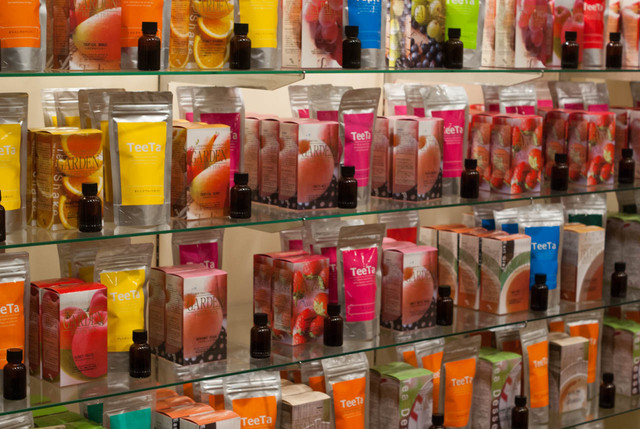 店内は木製のL字型のカウンターの作り。壁面には目一杯カラフルな箱に入ったティーバッグが並べられています。
