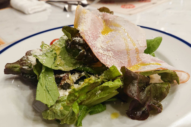 モッツァレラ、パルミジャーノ、最後に薄くスライスしたリコッタチーズの3種のチーズと、生ハム、マッシュルームの具材のバランスがたまらなくおいしい。
