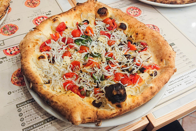 受賞ピッツァはしらすがたっぷり、チーズレスのピッツァ。物足りないかなと食べる前は思っていたけれども、さっぱりとした味わいでありながらニンニクやブラックオリーブ、ケッパーのアクセントが素晴らしい一枚。