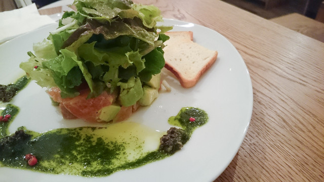 タルタル風に仕上げて盛り付けられており、野菜もたっぷり。アボカドの滑らかな食感と新鮮なサーモンのバランスが最高に良いのですが、バジルソースが全体を綺麗にまとめます。アボカドが嫌いでなければ、頼んで損はない一皿です。