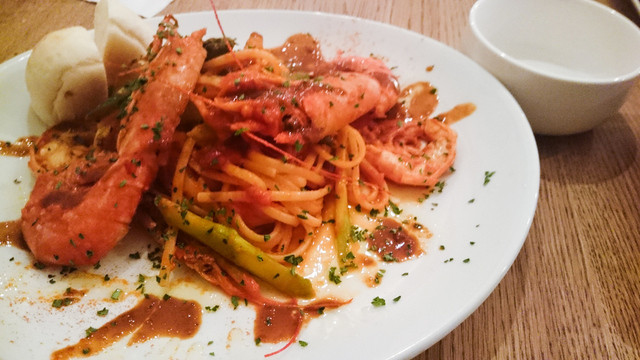 パスタはトマトソースが好きなウチと同行者。迷わずこの日のお薦めのパスタをオーダーしたのですが、これ、トマトクリームや無くて海老パスタですよっ。