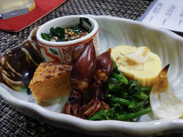 付き出しからなかなか豪華。滋味深いホタルイカや、しっとりとしただし巻き玉子、菜の花……いやいや、これ居酒屋レベルじゃないですよ。さっそく同行者はビールをぷはーっしてますよ。