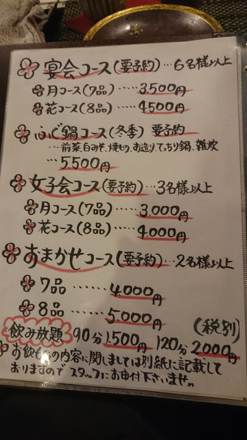 この日はアラカルトで色々と頼んでみたんですが、おまかせのコースがかなりお得な様子。メニューにない物で興味深いものがお隣さんに提供されるので、羨ましくなってしまいました。7品で4,000円のおまかせコースもお得ですが、女性3名以上の女子会コースの3,000円はお得すぎるでしょ。本当に。