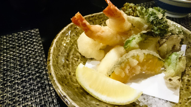 天ぷらは海老、穴子、春野菜と定番でありながら、それぞれの素材を活かしたもの。荒めの岩塩が添えられているのですが、軽く出汁に浸けて食べるのも美味しいです。