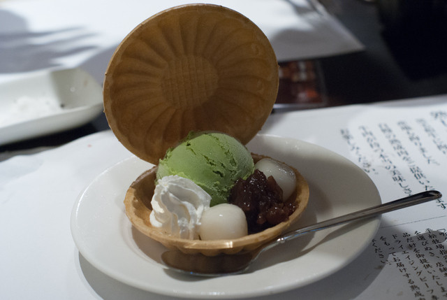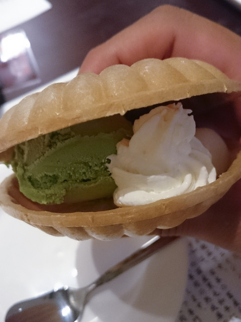 デザートには最中。抹茶アイスに生クリームと、そのまま食べても美味しいですが、やっぱり挟んで手に持って食べたいですよね。
