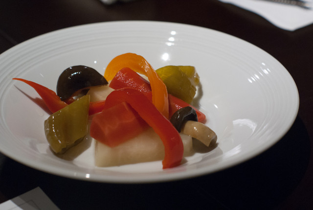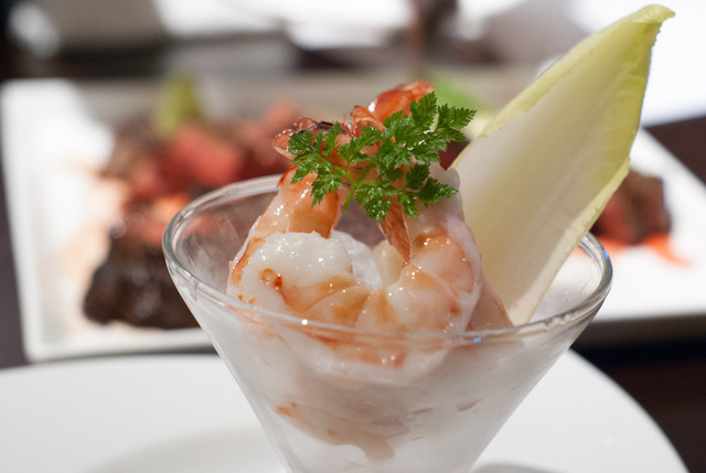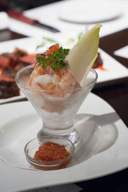 ちょっとお肉から離れて、シュリンプカクテルと京野菜のピクルス。ぷりっぷりの海老とさっぱりとした酸味のピクルスで、ちょっとすっきりとした気分に。
