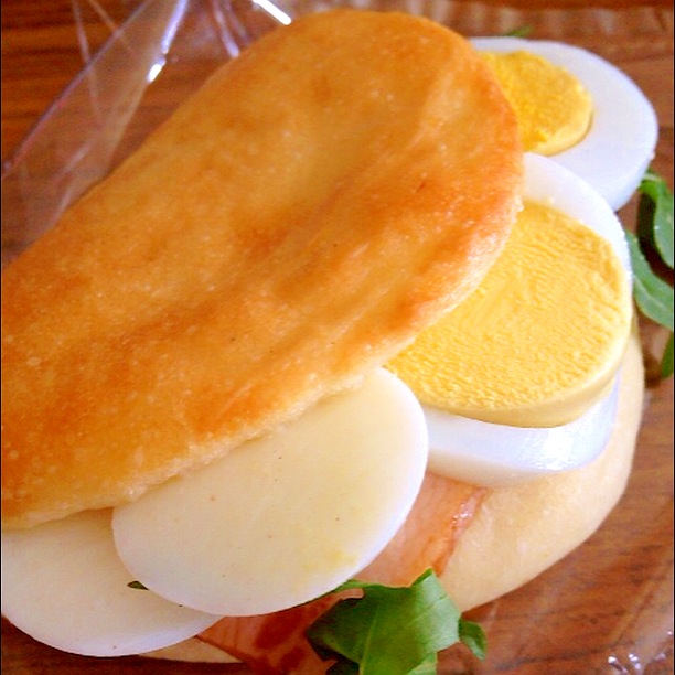 甘みの強い中華街の焼き豚のような厚みのあるベーコンに、ルッコラ、ゆで卵を合わせたベーグルサンドは、食べ応えがあります。