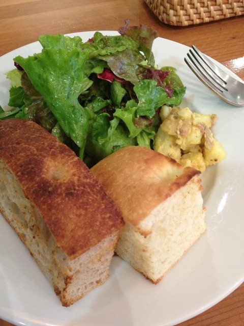 サラダはこの日はポテトサラダとグリーンサラダ。ポテトサラダはカレー風味でほんのり冷ため、グリーンサラダのドレッシングはシンプルな塩味の強くてほんのりと温かいと対比が効いています。