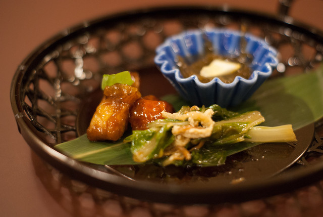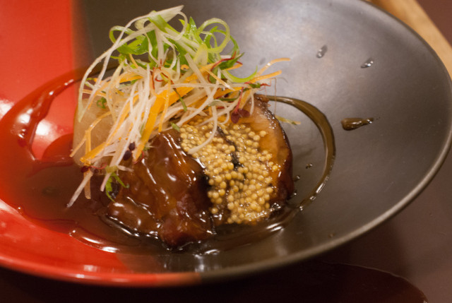 ホロッと崩れる角煮の旨味は当然のこと、直前にちょこっと炙ったその表面の香りと舌触りが面白い。これまた変化球ですが、かなり切れています。粒マスタードと甘味の強いタレに、これまた皿をなめ回したい気分。