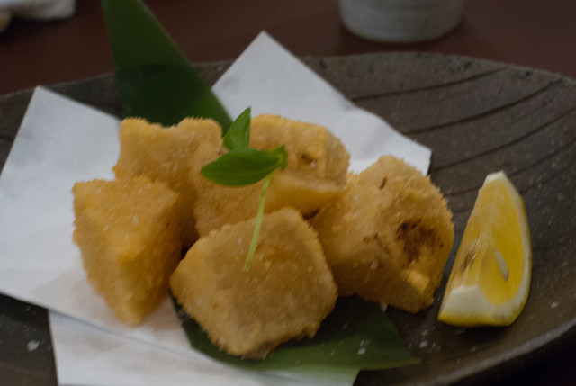 ウスターソースをダボダボとかけるタイプのコロッケではなくて、お皿に添えられたのはマスカルポーネチーズと白味噌と、京都祇園の原了郭の黒七味を混ぜた特製ソース。原了郭の黒七味が大好きな私にはこれだけでも最高なんですが、このソース、マスカルポーネが物凄く効いていて、ついつい指で舐めて日本酒をくびりっ。うっま~