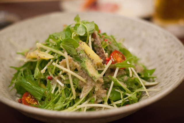 ドレッシングの代わりにバーニャカウダソースをかけたサラダ。