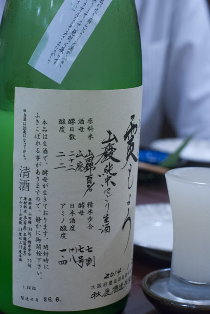 なんたって、出していただいたのが能勢のお酒「秋鹿」の「霙もよう 純米吟醸活性にごり」発泡性のある日本酒ですが、これがまたとんでもなく美味いです。