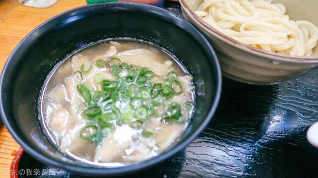 美しい白肌のうどんを…… 豚トロの脂が溶け出した、濃厚なつけ出汁へダイブ!