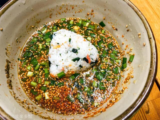 うどん(小麦)を食べた後のタレに、おむすび(米)を投入して混ぜ混ぜ。
