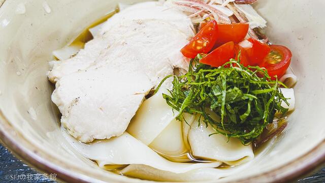 まず蒸し鶏(胸肉)がめーちゃーめーちゃー美味しい。ふわっふわさっくさく。鶏肉の香りが凄い。この肉新鮮?って思うくらいの蒸し鶏(いや、極上鶏叉焼です)ミョウガとプチトマトと紫蘇とぶっかけ出汁に混ぜて食べる冷たいおうどん。極上冷麺です。毎回言うてますが……『麺紡』さんの麺はホンマに飲めます。