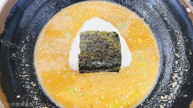 あっという間に完食できる美味しさ。麺食べ終わってもまだスープが残ってます。そこに……オプションのおむすびどーん!おむすびを崩して……ココでレンゲが大活躍。担担丼 最高の〆でございます。炭水化物and炭水化物。