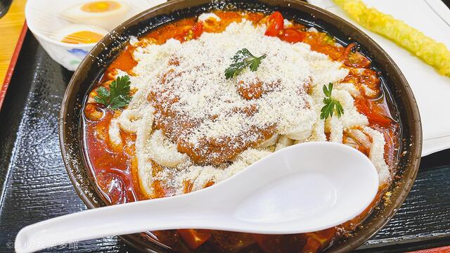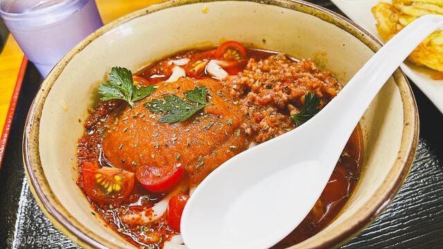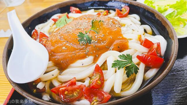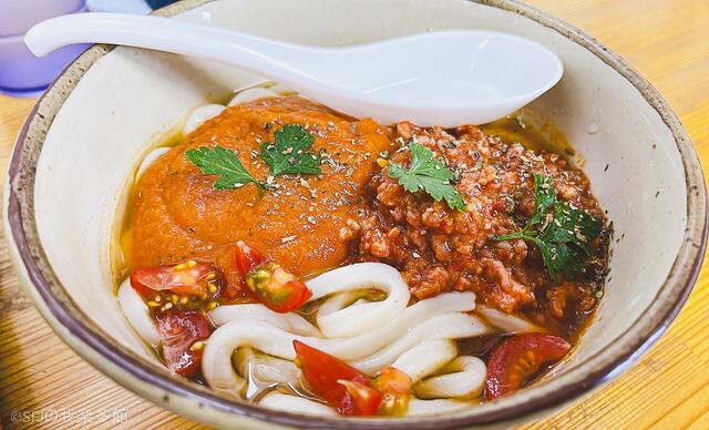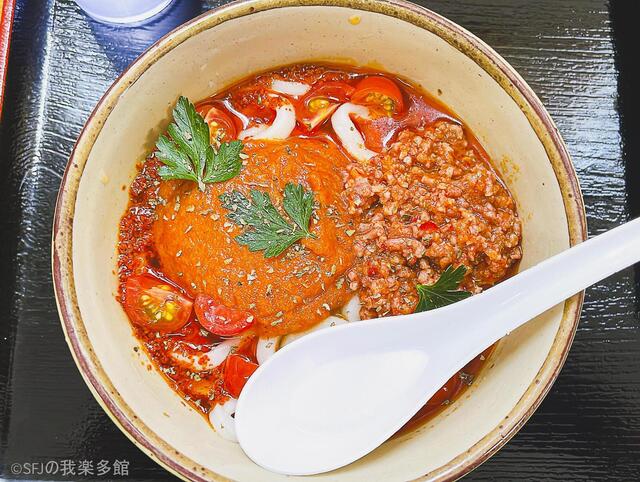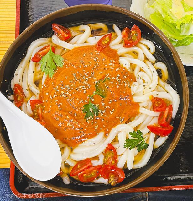 甘味と酸味と旨味たっぷりのトマト餡がプリモチなのに喉越しが良い麺によく絡み、パセリの苦みが良いアクセントになる……啜ってる間だけクリスマス並みの涼感が口一杯に広がるおうどんです。(食べた後、秒で現実の戻されますが)