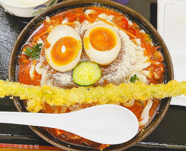 アスパラ天も食べ終わったので、あらためてよーく掻き混ぜて頂きます。麺紡さんの麺にトマトベースの出汁がよく絡みます。パスタ食べてるみたいな味。でも食感はもちぷるなさぬきうどん。